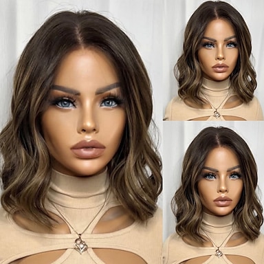 Parrucca con chiusura in pizzo 5x5, senza colla, con mèches, caschetto corto, parrucca frontale in pizzo 13x4, parrucca bionda ondulata con capelli del bambino pre-pizzicati per donna
