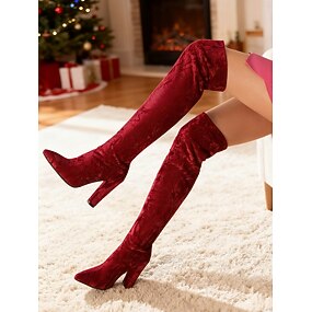 stivali sopra il ginocchio in velluto rosso da donna con tacchi spessi: calzature invernali alla moda, perfette per feste di Natale, serate fuori e occasioni speciali