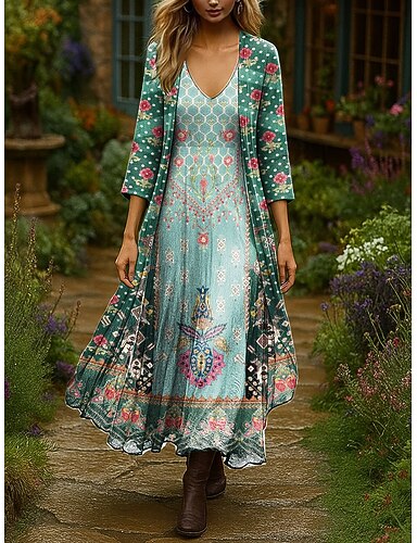 Per donna Insieme del vestito Vestito maxi Abito a trapezio Vacanza Boho Floreale Grafico Stratificato Stampato Abito maxi Manica 3/4 Scollo a V All'aperto Quotidiano Rosa Blu Verde Primavera Autunno