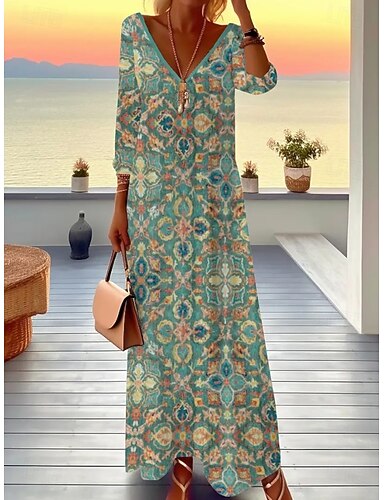 Abito Midi Donna V Neck Maniche Lunghe Kaftan Leggero Fit Largo Abito Shift Casual Uscita Fit Largo Grafico Geometrico Maniche Lunghe V Neck Rosa Blu Verde Autunno