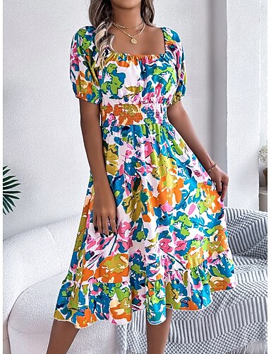 Per donna Abito Midi Abito a trapezio Vacanza Casual All'aperto Uscire Vestibilità regolare Floreale Grafico Manica Corta Collo quadrato Blu Rosso Verde Estate Primavera