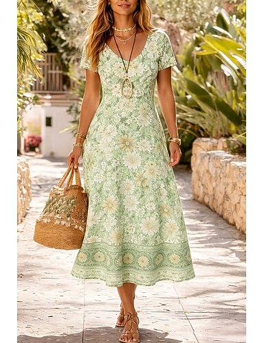 Per donna Abito Midi Abito a trapezio Vacanza Casual All'aperto Uscire Vestibilità aderente Floreale Grafico Manica Corta Scollo a V Nero Rosso Verde Estate Primavera