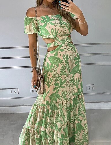 Per donna Abito Midi Abito Floreale Abito Stampato Moda Moderno All'aperto Vacanza Ferie Vestibilità regolare Fiore Manica Corta Senza Spalle Verde acqua Arancione Verde Azzurro Estate