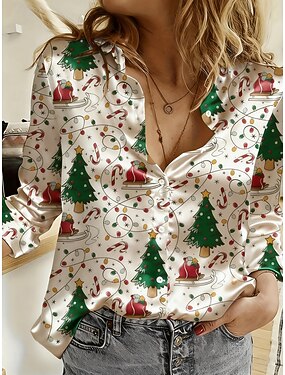 Natale Per donna Camicia Grafico Albero di Natale Elegante Bohemien Vintage Manica Lunga Colletto a Camicia Top Regolari Lavoro Quotidiano Bottoni Stampato Rosa Rosso Viola Verde Primavera Autunno