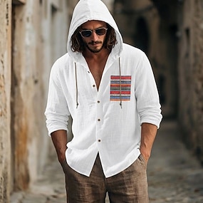 Per uomo Camicia Camicia di lino Camicia Estiva Camicia da Spiaggia Camicia con Bottoni Camicia con cappuccio Boho Casuale Vacanza Bianco Manica Lunga Con Cappuccio Estate Primavera Abbigliamento