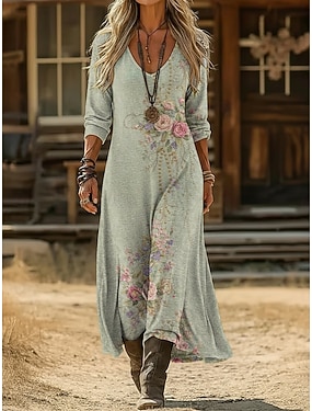 Per donna Abito lungo maxi Abito Boho Abito Vintage Vestito Casual Vintage Quotidiano All'aperto Vacanza Vestibilità comoda Floreale Manica Lunga Scollo a V Blu Verde chiaro Blu marino Verde scuro