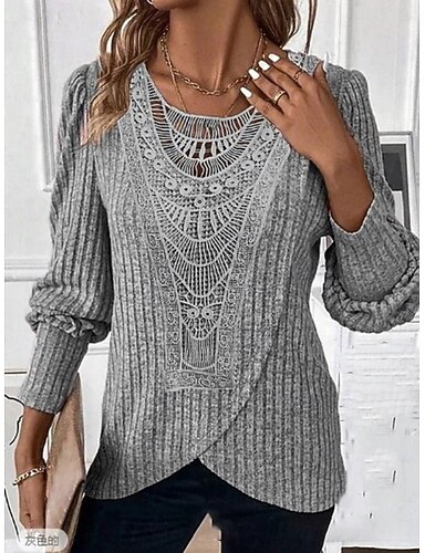 Per donna Blusa Tinta unica Elegante Casual Manica Lunga Girocollo Top Regolari Quotidiano Pizzo Patchwork Rosa Verde Grigio Primavera Autunno Inverno