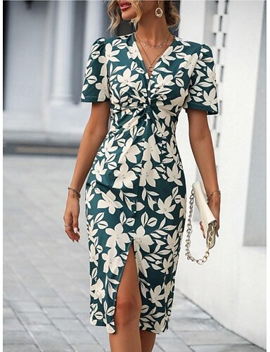 Per donna Abito al ginocchio Vestito Casual Abito Floreale Elegante Moda Moderno All'aperto Vacanza Uscire Vestibilità regolare Floreale Manica Corta Scollo a V Rosso Blu marino Verde Estate Primavera