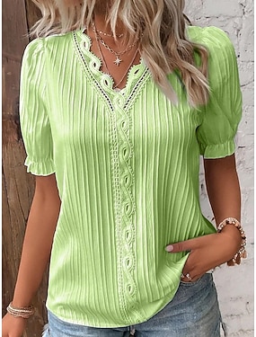 Per donna Maglietta Pizzo Patchwork Semplice Moda Elegante Classico Manica Corta Scollo a V Top Regolari Quotidiano Uscire Weekend Nero Bianco Giallo Azzurro cielo Viola Estate Primavera