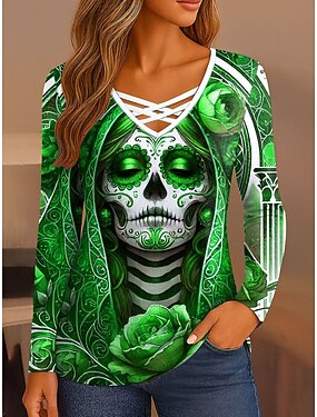 Maglietta da donna Teschi Grafica Vintage Stilosa Classica Manica Lunga Scollo a V Top Regolari Quotidiani Stampa Rossa Blu Viola Verde Grigia Primavera Autunno