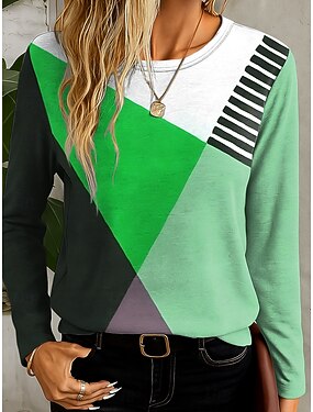 Per donna Maglietta Stampato Blocco di colori Geometria Moda Moderno Manica Lunga Girocollo Top Regolari Quotidiano Vacanza Blu Rosa Verde scuro Verde Primavera & Autunno