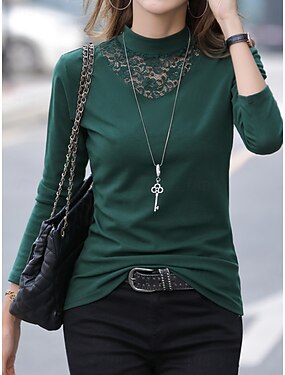 T-Shirt Donna Colore Unito Stile Casual Manica Lunga Collo a V Top Regolari Giornalieri Pizzo Patchwork Blu Nero Bianco Verde Grigio Scuro Primavera Autunno Inverno