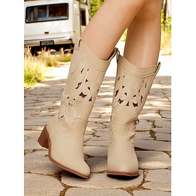 stivali da cowboy beige con ritagli western da donna – stivali con tacco a blocco ricamati a metà polpaccio per eventi country, rodei e moda da festival