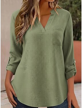 Per donna Camicie di cotone e lino Top estivi Blusa Top Eleganti Arricciato Patchwork Tasca Tinta unica Semplice Elegante Vintage Signore Manica 3/4 Colletto a Camicia Top Regolari Quotidiano Lavoro