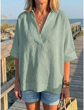 Per donna Blusa Camicia in finto lino Bottoni Tinta unica Quotidiano Elegante Essenziale Mezza Manica Scollo a V Top Regolari Quotidiano Blu Nero Giallo Rosso Viola Estate Primavera Autunno