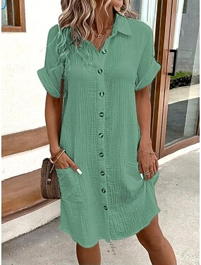 Per donna Mini Abito Finto cotone e lino Abito Camicia Abiti in cotone e lino Abito Invernale Casual Vacanza Vestibilità regolare Semplice Manica Corta Scollo a V Blu Nero Bianco Giallo Estate