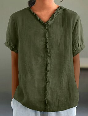 Per donna Blusa Finto cotone e lino Arricciato Volant Semplice Elegante Vintage Casual Mezza Manica Girocollo Top Regolari Quotidiano Ferie Uscire Blu Verde Albicocca Estate Primavera