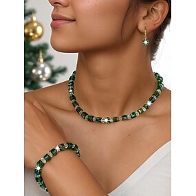set di gioielli da donna con perle e pietre preziose verdi, 3 pezzi, girocollo vintage, braccialetto &anello per feste di Natale, regali per le feste &serate eleganti