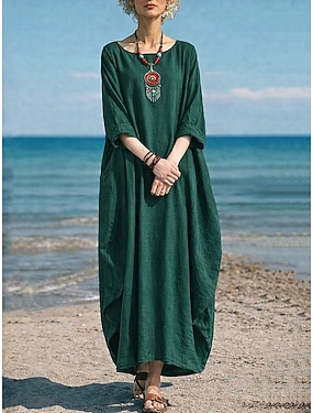 Abito in cotone e lino da donna Abito a trapezio Abito estivo Abito Casual da giorno Vestibilità regolare Semplice Maniche 3/4 Collo rotondo Blu Bianco Rosso Verde scuro Estate Primavera Autunno