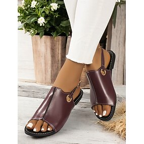 sandali da donna in similpelle marrone con punta aperta – scarpe basse casual con cinturino posteriore e fibbia in strass per l'estate e l'uso quotidiano