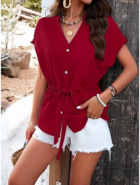 Per donna Camicia Blusa Tinta unica Moda Informale Manica corta Collo dentellato Top regolari Giornaliero Bottoni A cordoncino Nero Vino Blu Verde Beige Estate