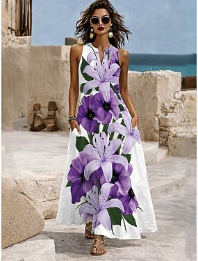 Per donna Abito maxi Vestito in Chiffon Vestito Casual Vestito a ruota Abiti Boho Chic Bohemien Vacanza Tropicale Spiaggia Ferie Data Vestibilità regolare Floreale Grafico Senza Maniche All'americana