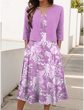 Set di abiti da donna a due pezzi abito midi con giacca abito elegante a linea maniche a ¾ casual stampa floreale scollo rotondo data rosa blu viola vestibilità regolare