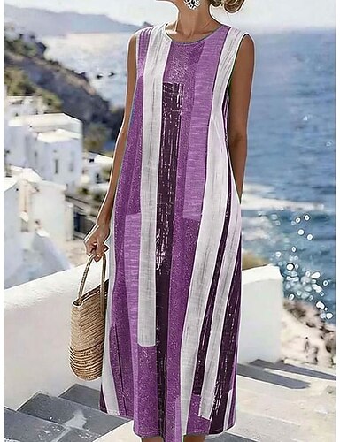 Per donna Abito maxi Vestito Casual Vestito T-Shirt Elegante Moda Moderno All'aperto Spiaggia Vacanza Vestibilità regolare A righe Manica Corta Girocollo Blu Nero Viola Marrone Estate Primavera