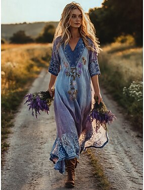 Per donna Abito maxi Abito Boho Abito Vintage Vestito Casual Vintage Quotidiano All'aperto Vacanza Vestibilità regolare Floreale Manica Lunga Scollo a V Blu Viola Marrone Primavera Autunno
