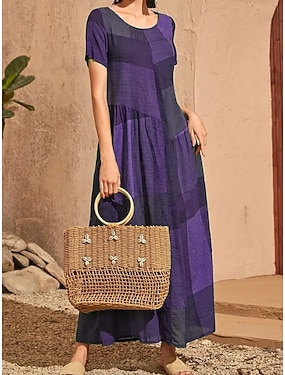 Per donna Abito maxi Finto cotone e lino Abito Boho Vestito Casual Vintage Moda Moderno All'aperto Vacanza Uscire Vestibilità regolare Geometrico Manica Corta Girocollo Blu Rosso Borgogna Viola