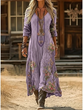 Per donna Abito Lungo Maxi Abito Abito Boho Vestito Casual Abito Etnico Vintage Quotidiano All'aperto Vacanza Vestibilità regolare Floreale Manica Lunga Scollo a V Viola Estate Primavera Autunno