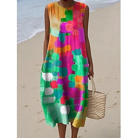 Abito Midi da Donna in Lino Similare Vestito Estivo Vacanza Casual Spiaggia Uscita Vestibilità Larga Grafica Geometrica Senza Maniche Collo Tondo Blu Rosso Viola Verde Estate Primavera