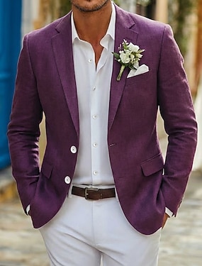 Per uomo Blazer di Lino Giacca Sportiva Collare di chiusura Moda Casual Tinta unita Blu Viola Verde Vestibilità su misura Monopetto Due Bottoni
