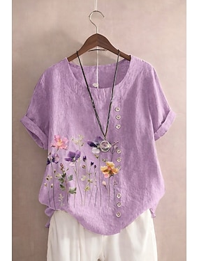 Per donna Camicia Blusa Finto cotone e lino Stampato Floreale Grafico Casual Manica Corta Girocollo Top lunghi Quotidiano Blu Viola chiaro Arancione Verde Estate Primavera