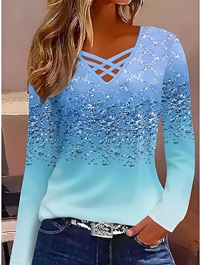 Per donna Maglietta Taglio Stampato Ombre Grafico Vintage Elegante Classico Manica Lunga Scollo a V Top Regolari Quotidiano Blu Primavera Autunno