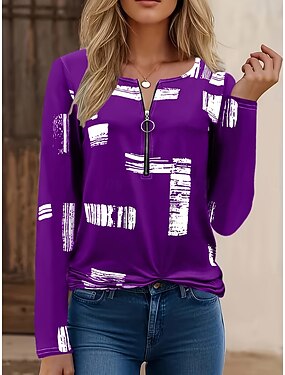 Per donna Maglietta Cerniera Stampato Grafico Geometrico Vintage Moda Elegante Manica Lunga Girocollo Scollo a V Top Regolari Quotidiano Blu Viola Verde Primavera Autunno Inverno