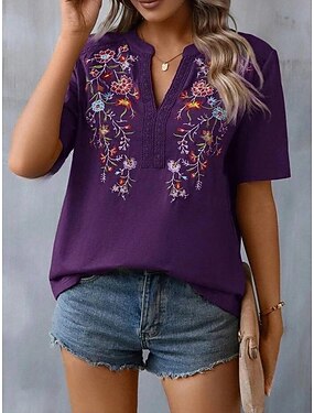 Per donna Camicia di Pizzo Maglietta Pizzo Patchwork Ricamato Floreale Moda Moderno Mezza Manica Scollo a V Top Regolari Quotidiano Vacanza Nero Verde militare Blu marino Viola Marrone Estate