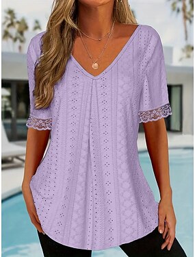 Per donna Maglietta Pizzo Ricamato Semplice Elegante Moda Moderno Manica Corta Scollo a V Top Regolari Quotidiano Weekend Blu Rosa Viola Estate Primavera