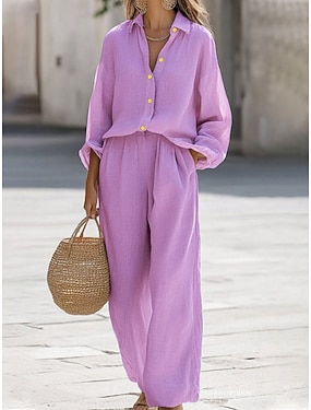 Per donna Set di Pantaloni Bolero Finto cotone e lino Manica Lunga Colletto a Camicia Tinta unica Moda Streetwear Casuale Quotidiano All'aperto Blu Viola Arancione Estate Vestibilità comoda