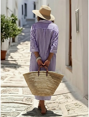 Per donna Abito Midi Finto cotone e lino Abito in cotone e lino Moda Moderno Vacanza Uscire Weekend Vestibilità regolare A righe Manica Lunga Colletto a Camicia Blu Giallo Verde chiaro Rosa Estate
