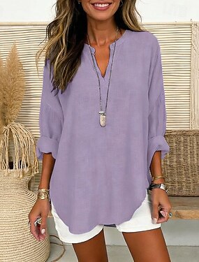 Per donna Camicia Abbottonare Blusa Finto cotone e lino Bottoni Semplice Essenziale Moderno Manica Lunga Scollo a V Top Regolari Quotidiano Ferie Blu Rosa Viola Verde Cachi Estate