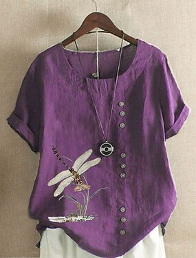 Maglietta da donna 100% cotone Blusa Stampa con Bottoni Weekend Streetwear Base Casual Simile al Lino Maniche Corte Collo A Giro Bianco Estate Primavera