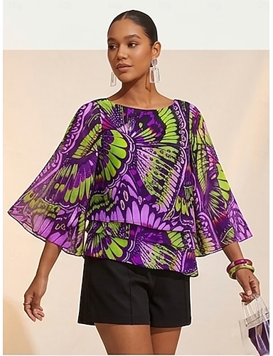 camicetta da donna con stampa floreale viola, maniche in chiffon elasticizzato, scollo a barca, casual, comoda, primavera estate autunno vacanza