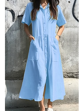 Per donna Normale Abito maxi Finto cotone e lino Abito Camicia Abito lungo in cotone Casual Sport & Outdoor Data Vestibilità regolare Tinta unica Colletto a Camicia Blu Giallo Verde Primavera Autunno