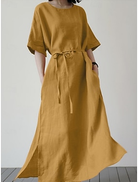 Per donna Abito Midi Finto cotone e lino Abito a Tubino Abito estivo in cotone Casual Quotidiano Weekend Vestibilità comoda Semplice Manica Corta Girocollo Rosa Blu marino Marrone Kaki Estate