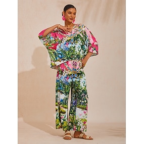 abito lungo in raso con maniche a dolman e stampa botanica tropicale per le vacanze