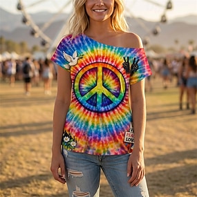 Retrò Vintage Anni '80 T-shirt Monospalla Maniche corte Hippie Disco Stampa tie dye Simboli di pace Costume Per donna Halloween Carnevale Festival Musicale Festa a tema retrò Adulti Maglietta