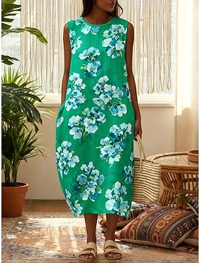 Per donna Abito Midi Finto cotone e lino Abito Boho Abito a Tubino Vestito Estivo Vintage Quotidiano All'aperto Vacanza Vestibilità regolare Floreale Senza Maniche Girocollo Rosa Verde militare Blu