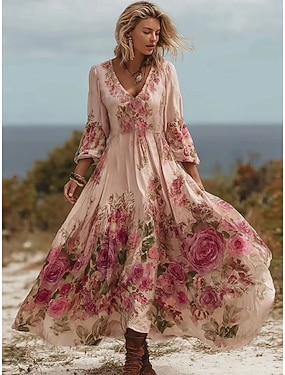 Per donna Abito Midi Abito a trapezio Festa Casual Boho Spiaggia Data Vestibilità comoda Floreale Grafico Manica Lunga Scollo a V Rosa Estate Primavera