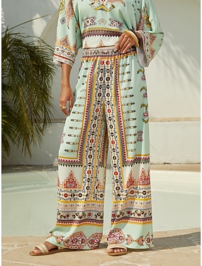pantaloni a gamba larga in raso setoso con totem etnico